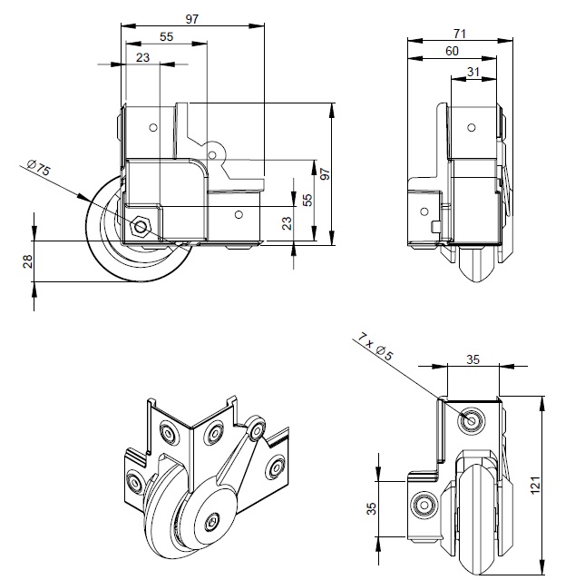 Recessed Corner Castor 75mm with soft wheel, Die-Cast Housing. The wheel is made of a resilient material which makes it nearly noiseless.